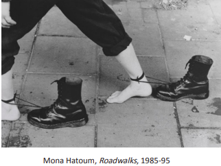 درحدود ده سال بعد در اروپا، مونا حاطوم (متولد 1952،هنرمند فلسطینی/انگلیسی- متولد لبنان)، در اثری که به مجموعهی عملیات جاده(1985-95) تعلق دارد، با چکمههای سیاه سربازی که با بند کفش به پشت پاهای خود گره میزند، در خیابانهای محله پرینگستون (لندن) قدم میزند. این اثرکه از یک سو ازتجربهی شخصی هنرمند و مهاجرت نشات میگیرد، در عین حال برای همدردی با شرایط سخت اقتصادی-اجتماعی سیاهپوستان آن منطقهی لندن و همدردی با آنها برعلیه خشونت پلیس بود. در همان سال نیروهای پلیس زن سیاهپوستی را در جریان تظاهرات به قتل رسانده بودند. نظرات بینندگان در خیابان که از اهالی هنر نبودند برای هنرمند بسیار مطبوع بود؛« یکی از جالب ترینها مردی بود از گروه کارگرانی که در آنجا وقت استراحت ناهارشان بود. پرسید: این داره چیکار میکنه؟ منظورش چیه؟ خانوم سیاهپوستی که با سبد خریدش ازآنجا میگذشت، پاسخ داد: واضحه! پلیس داره دنبالش میکنه.»[8]